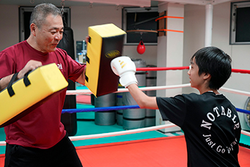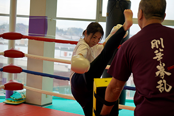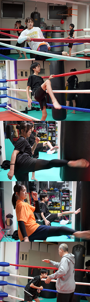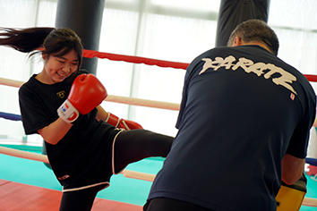 グローブがボロボロになるまでに3年、熱心にトレーニングに励んだ結果に道場生も大満足。次は何がいいかなど、アドバイスを聞く姿もみられた本日の昼キックも無事終了。